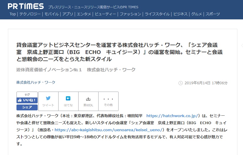 「シェア会議室 京成上野正面口(BIG ECHO キュイジーヌ)」の運営を開始しました 2019/06/19 プレスリリース 貸会議室アットビジネスセンターを運営する株式会社ハッチ・ワーク、「シェア会議室 京成上野正面口(BIG ECHO キュイジーヌ)」の運営を開始したリリースを配信しました。 詳細はこちらから。