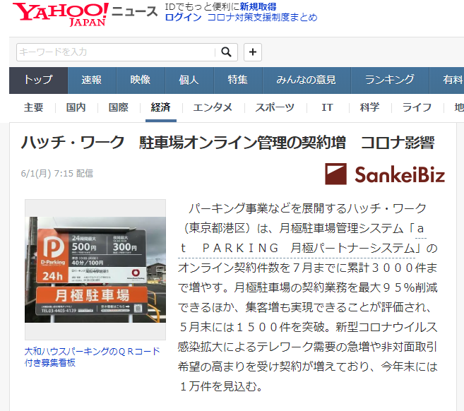 <Yahoo!ニュース>「ハッチ・ワーク 駐車場オンライン管理の契約増 コロナ影響」という記事が掲載になりました