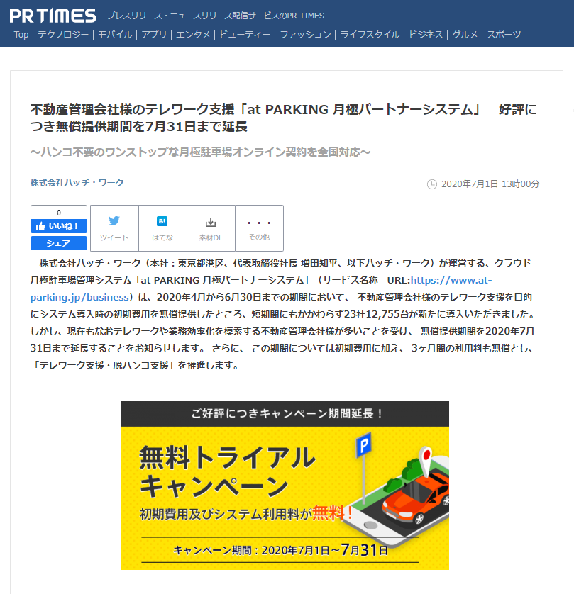 株式会社ハッチ・ワーク(本社:東京都港区、代表取締役社長 増田知平、以下ハッチ・ワーク)が運営する、クラウド月極駐車場管理システム「at PARKING 月極パートナーシステム」(サービス名称 URL:https://www.at-parking.jp/business)は、2020年4月から6月30日までの期間において、 不動産管理会社様のテレワーク支援を目的にシステム導入時の初期費用を無償提供したところ、短期間にもかかわらず23社12,755台が新たに導入いただきました。 しかし、現在もなおテレワークや業務効率化を模索する不動産管理会社様が多いことを受け、 無償提供期間を2020年7月31日まで延長することをお知らせします。 さらに、 この期間については初期費用に加え、 3ヶ月間の利用料も無償とし、 「テレワーク支援・脱ハンコ支援」を推進します。