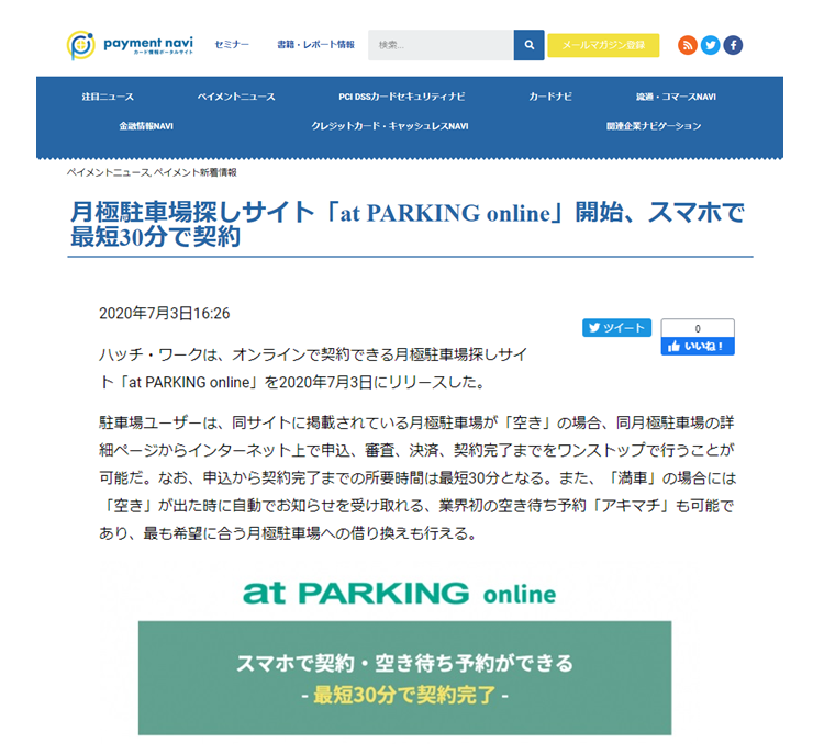<ペイメントナビ>「月極駐車場探しサイト「at PARKING online」開始、スマホで最短30分で契約」という記事で取り上げていただきました