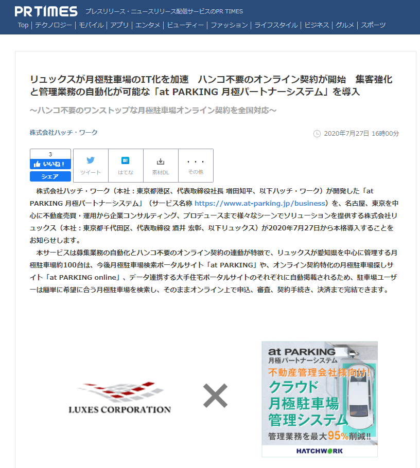 株式会社ハッチ・ワーク(本社:東京都港区、代表取締役社長 増田知平、以下ハッチ・ワーク)が開発した「at PARKING 月極パートナーシステム」(サービス名称 https://www.at-parking.jp/business)を、名古屋、東京を中心に不動産売買・運用から企業コンサルティング、プロデュースまで様々なシーンでソリューションを提供する株式会社リュックス(本社:東京都千代田区、代表取締役 酒井 宏彰、以下リュックス)が2020年7月27日から本格導入することをお知らせします。