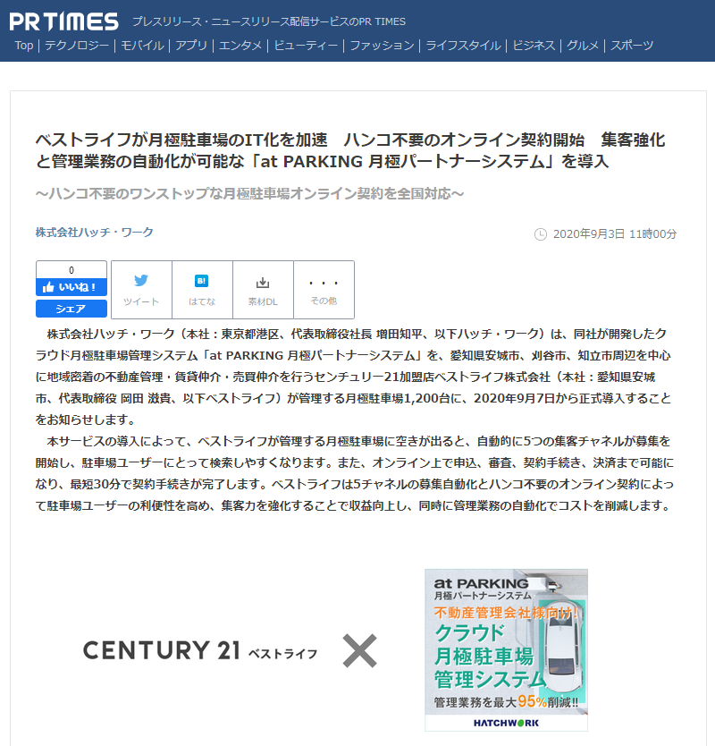 株式会社ハッチ・ワーク(本社:東京都港区、代表取締役社長 増田知平、以下ハッチ・ワーク)は、同社が開発したクラウド月極駐車場管理システム「at PARKING 月極パートナーシステム」を、愛知県安城市、刈谷市、知立市周辺を中心に地域密着の不動産管理・賃貸仲介・売買仲介を行うセンチュリー21加盟店ベストライフ株式会社(本社:愛知県安城市、代表取締役 岡田 滋貴、以下ベストライフ)が管理する月極駐車場1,200台に、2020年9月7日から正式導入することをお知らせします。