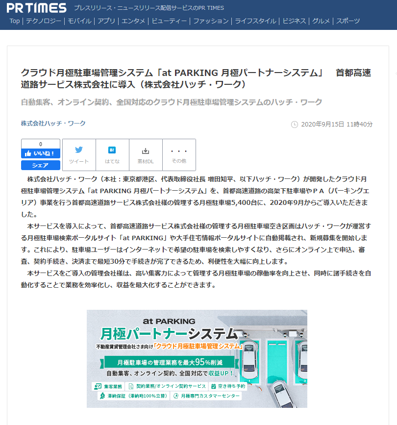株式会社ハッチ・ワーク(本社:東京都港区、代表取締役社長 増田知平、以下ハッチ・ワーク)が開発したクラウド月極駐車場管理システム「at PARKING 月極パートナーシステム」を、首都高速道路の高架下駐車場やPA(パーキングエリア)事業を行う首都高速道路サービス株式会社様の管理する月極駐車場5,400台に、2020年9月からご導入いただきました。