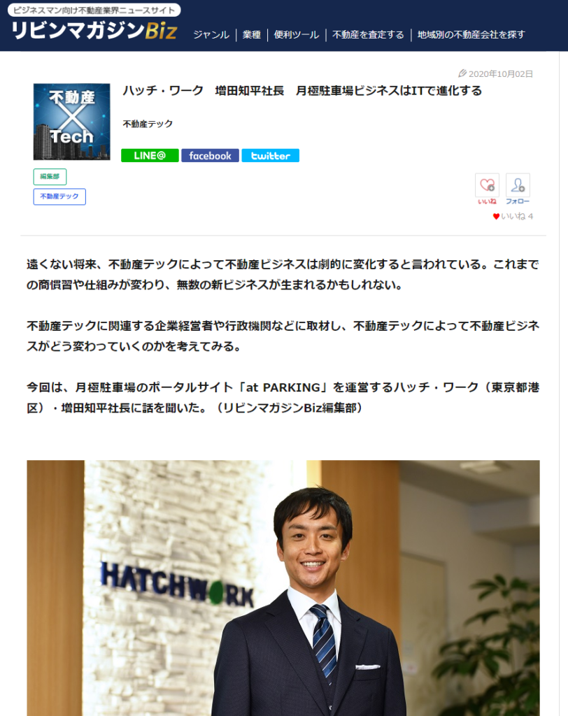 <リビンマガジンBiz>「ハッチ・ワーク 増田知平社長 月極駐車場ビジネスはITで進化する」という記事で取り上げていただきました