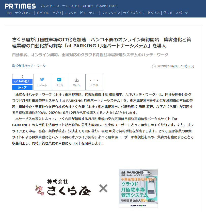 株式会社ハッチ・ワーク(本社:東京都港区、代表取締役社長 増田知平、以下ハッチ・ワーク)は、同社が開発したクラウド月極駐車場管理システム「at PARKING 月極パートナーシステム」を、栃木県足利市を中心に地域密着の不動産管理・賃貸仲介・売買仲介を行う株式会社さくら屋(本社:栃木県足利市、代表取締役 島田 將行、以下さくら屋)が管理する月極駐車場約500台に2020年10月12日から正式導入することをお知らせします。