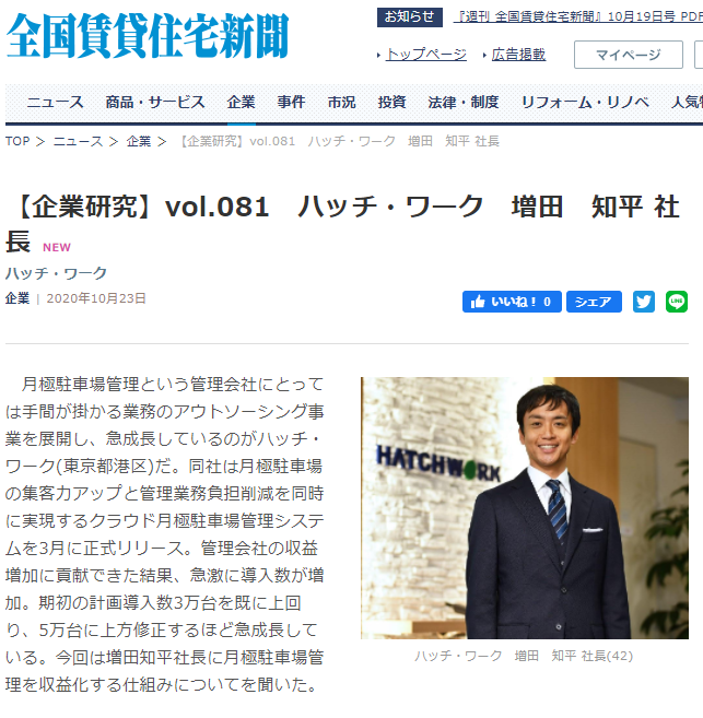 要約すると、「月極駐車場管理という管理会社にとっては手間が掛かる業務のアウトソーシング事業を展開し、急成長しているのがハッチ・ワーク(東京都港区)だ。同社は月極駐車場の集客力アップと管理業務負担削減を同時に実現するクラウド月極駐車場管理システムを3月に正式リリース。管理会社の収益増加に貢献できた結果、急激に導入数が増加。期初の計画導入数3万台を既に上回り、5万台に上方修正するほど急成長している。今回は増田知平社長に月極駐車場管理を収益化する仕組みについてを聞いた。」と丁寧にまとめていただきました。