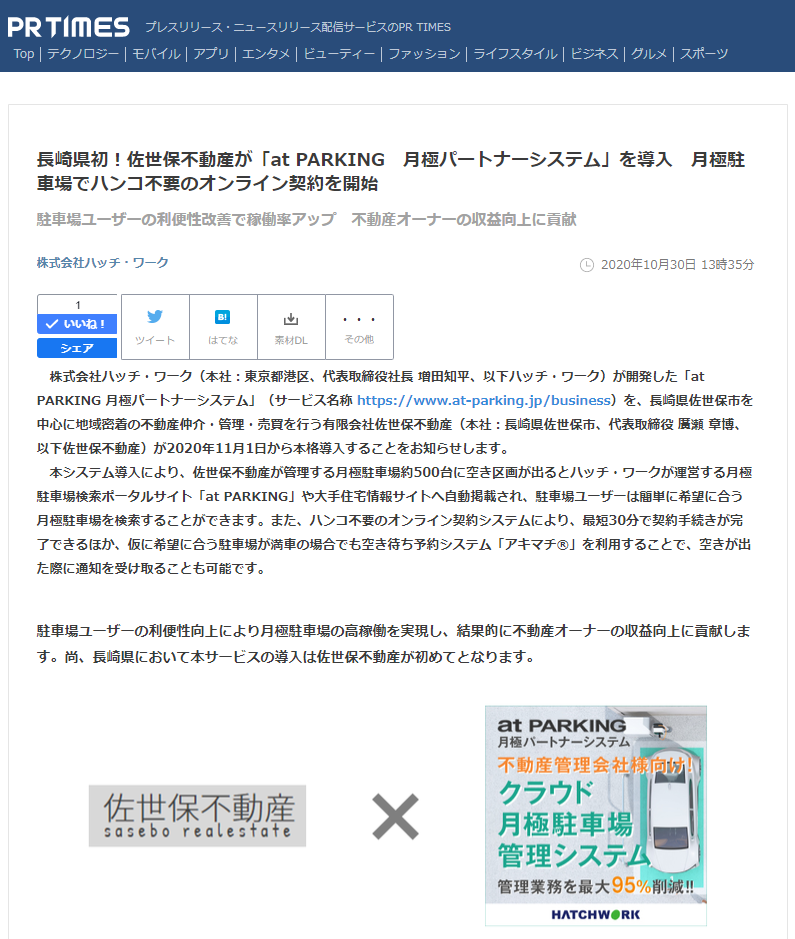 株式会社ハッチ・ワーク(本社:東京都港区、代表取締役社長 増田知平、以下ハッチ・ワーク)が開発した「at PARKING 月極パートナーシステム」(サービス名称 https://www.at-parking.jp/business)を、長崎県佐世保市を中心に地域密着の不動産仲介・管理・売買を行う有限会社佐世保不動産(本社:長崎県佐世保市、代表取締役 廣瀬 章博、以下佐世保不動産)が2020年11月1日から本格導入することをお知らせします。