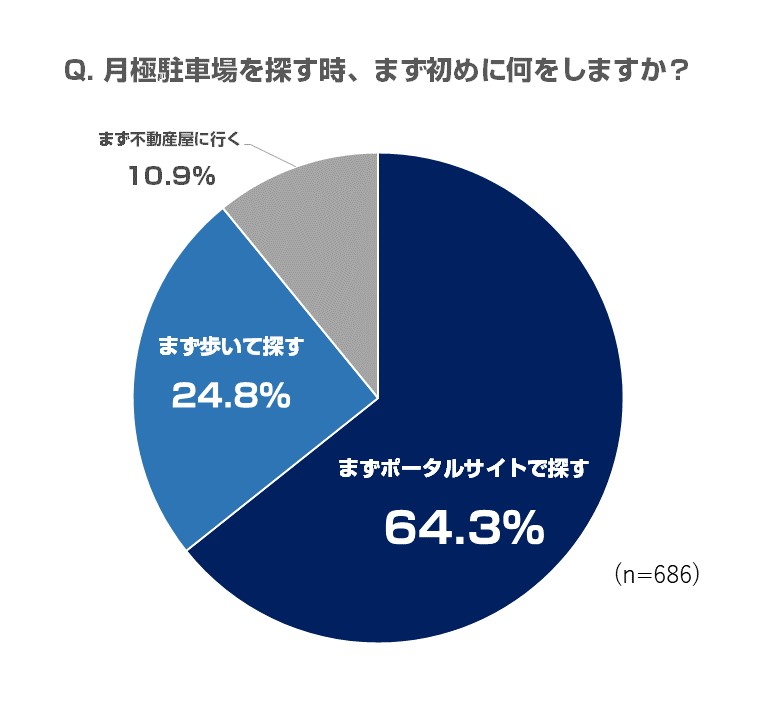 月極駐車場を探す方がまず初めに行うのがポータルサイトによる検索だという結果を得ました。既に住居探しは大手住宅情報サイトが主流となっていることや、スマートフォンの普及といった要因によるものと考察されます。