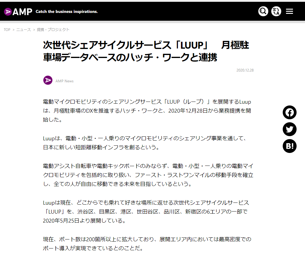 <AMP>「次世代シェアサイクルサービス「LUUP」 月極駐車場データベースのハッチ・ワークと連携」という記事で取り上げていただきました 2020/12/28 メディア情報 ビジネスメディアのAMPに「次世代シェアサイクルサービス「LUUP」 月極駐車場データベースのハッチ・ワークと連携」という記事で取り上げていただきました。 本文はこちらでご確認ください。