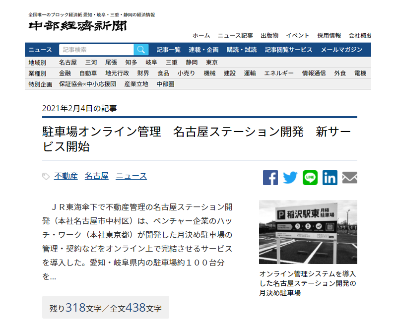 <中部経済新聞>「駐車場オンライン管理 名古屋ステーション開発 新サービス開始」という記事で取り上げていただきました