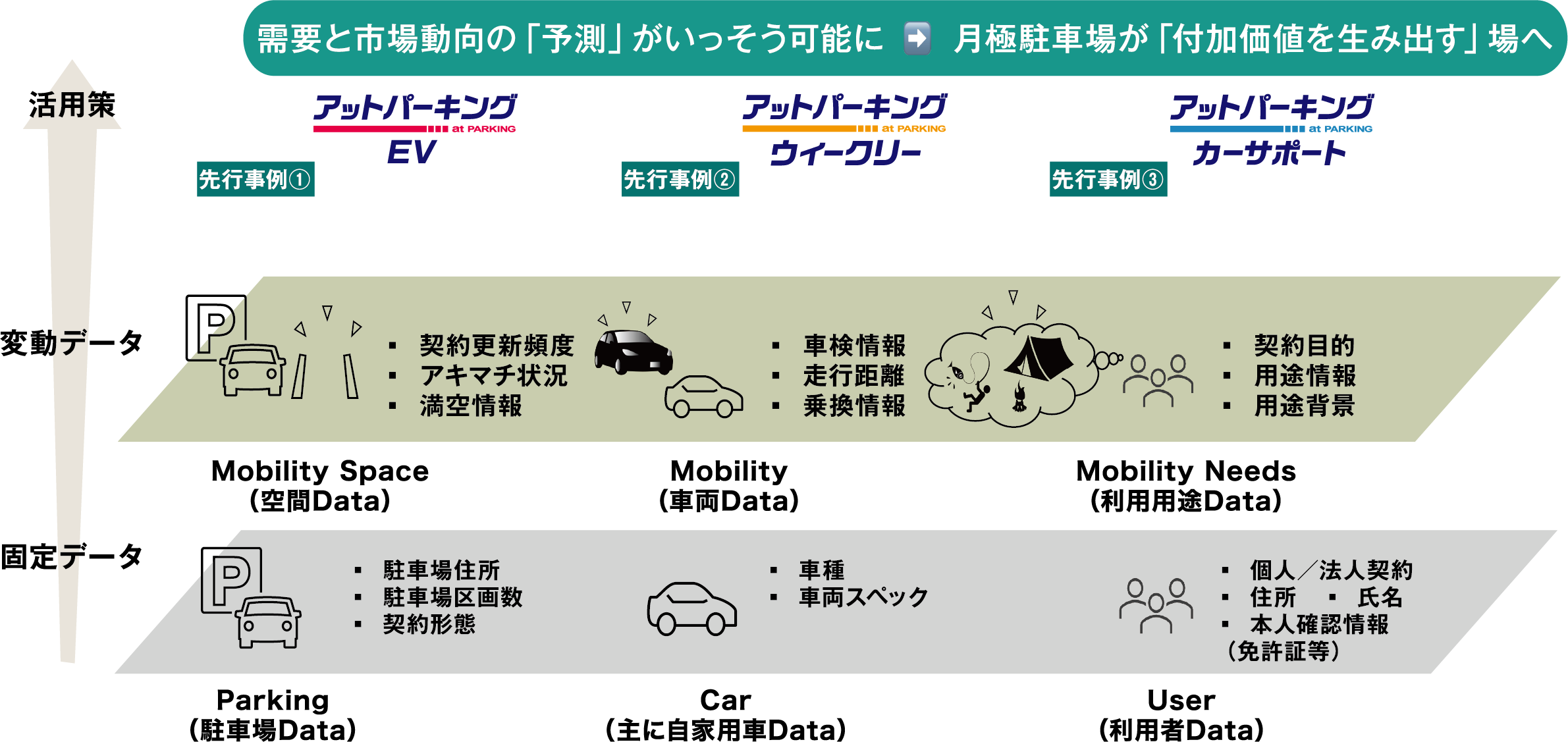 利用用途や駐車車両に関する情報、契約更新に関わる頻度など、動きのあるデータが集まることで、いっそう月極駐車場への期待や理想、つまり多様な需要予測分析などの活用が可能に。これに基づく推奨・提案などが実現できるようになります。